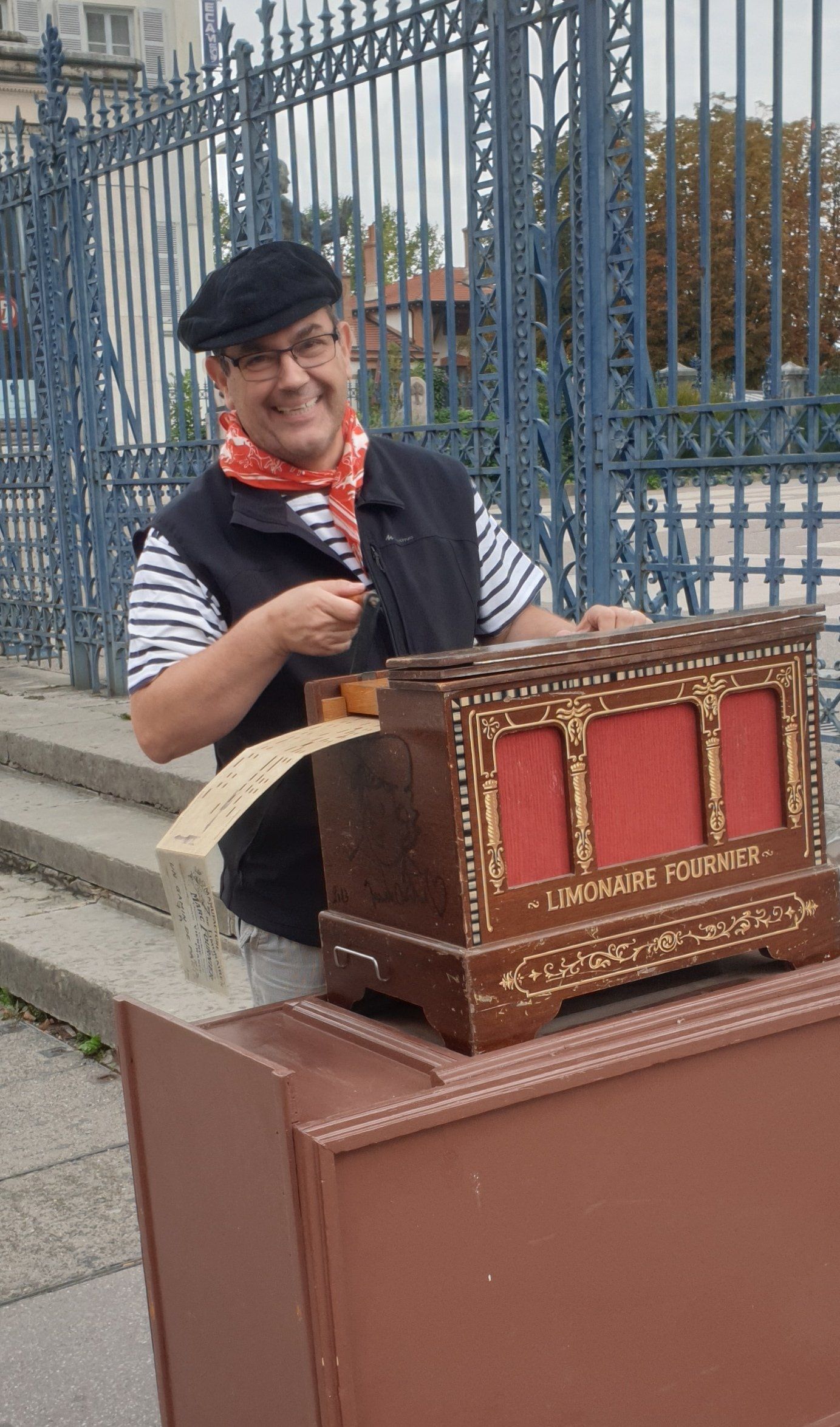 Au rythme des tours de manivelle, il interprète les grands classiques de la chanson française,